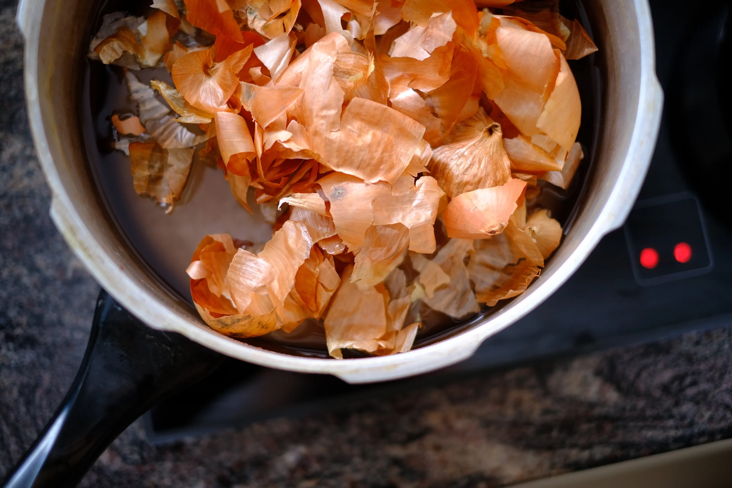 Nachdem das Färbebad eine Stunde lang geköchelt hat, kannst du die Zwiebelschalen abseihen und den Sud etwas abkühlen lassen. Nun gibst du den Stoff dazu und lässt ihn für etwa 1-8 Stunden darin schwimmen. Du kannst den Sud auch immer wieder mal etwas erwärmen um das Ergebnis zu intensivieren. Pflanzenfasern kannst du sogar leicht köcheln, tierische Fasern nur leicht erwärmen.